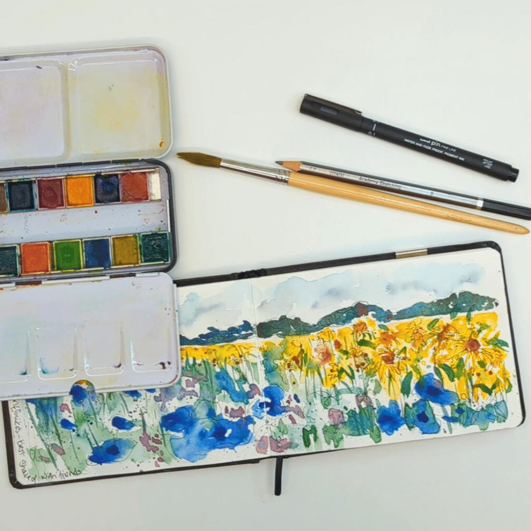 An online watercolour course for artists of all abilities. Learn how to paint stunning yet simple and fun landscapes indoors or out, and finish the course with a sketchbook full of your own beautiful art!